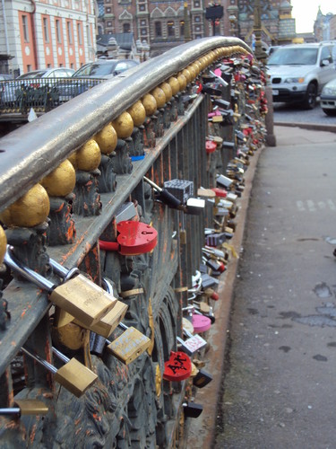 Não sei o que reza a tradição, mas sei como ela se manifesta. Os noivos vão à ponte sobre o canal que fica atrás do local onde foi assassinado o czar Alexandre II e deixam lá preso às grades um aloquete (artefacto designado por cadeado pelos portugueses nados e criados a sul do Mondego), com os nomes deles gravados e juras de amor eterno.